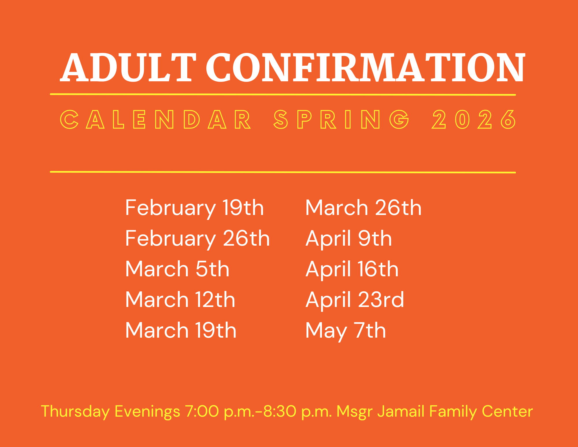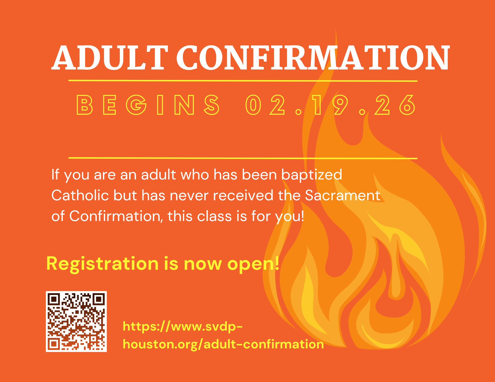 Welcome! Adult Confirmation is for adults who have been baptized in the Catholic faith and have received First Holy Communion. Preparation is offered twice per year, in the Fall and in the Spring. We would love to have you join us. In order to get started, you will need to set up an introductory meeting.